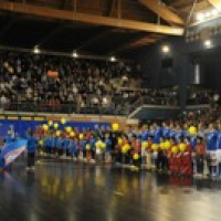 Nella foto, l’Italia schierata al centro del campo, con alle spalle lo splendido pubblico del PalaFacchetti.